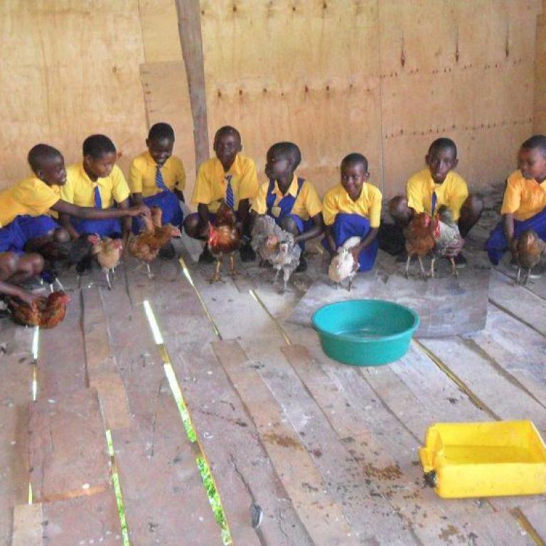 In unserem Schulbauernhof leben bereits Schweine, Ziegen und unsere Kuh Shamballa. Die Kinder lernen hier den Umgang mit den Tieren und die Zucht derer. Das Schweinezuchtprojekt ist schon sehr erfolgreich und wir hoffen, dass Kuh Shamballa bald auch Milch gibt. Jetzt ist noch ein Hühnerhof dazukommen, um neben Fleisch und Milch auch Eier auf den Speiseplan der Kinder zu bringen. Der Hühnerhof besteht aus einem Stall, einem Hahn und Hühnern.