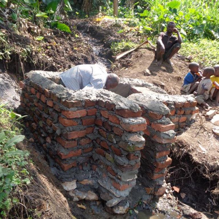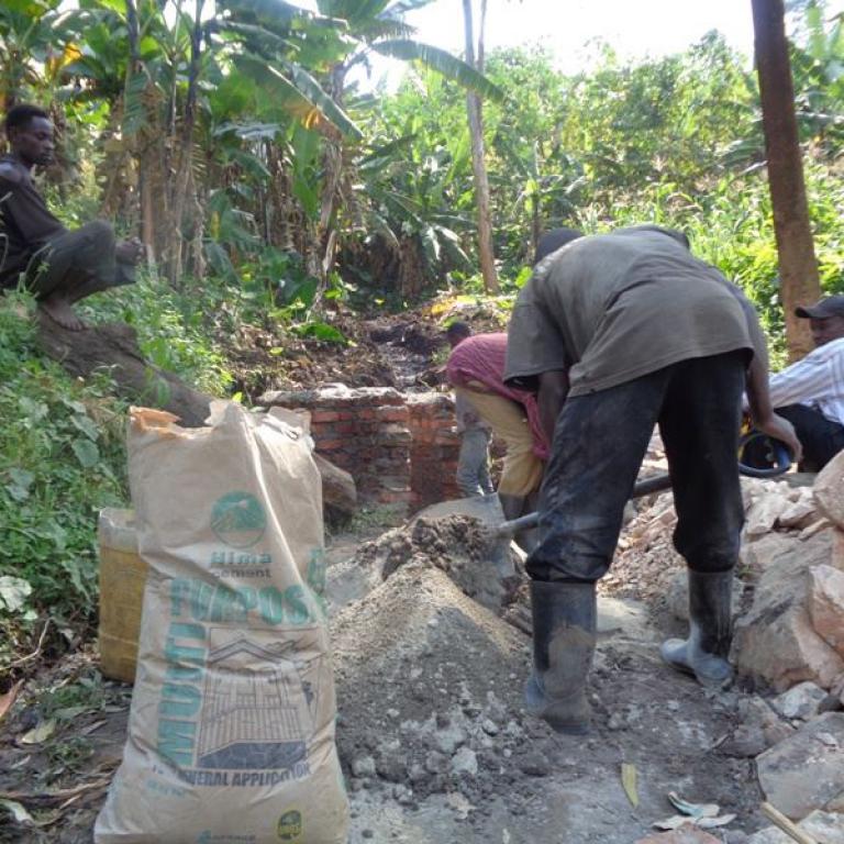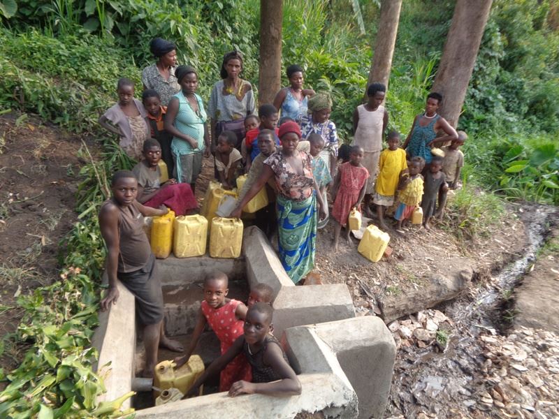 Wasserholen ist Kinder- und Frauenarbeit. Häufig müssen sie weit laufen, um aus einen kleinen Rinnsal mühsam das notwendige Wasser in die Kanister schöpfen zu können. Daher haben wir einige der Wasserquellen befestigen, um die Arbeit zu erleichtern und die Sauberkeit des Wassers zu verbessern. Die erste Hangsickerwasserquelle wurde über einen längeren Fließweg dräniert und der Auslauf in einem Betonbecken gefasst. So kann das Wasser nicht mehr verschlammen und kann weitgehend ohne Schlamm und Trübstoffe in die Kanister gefüllt werden. Es wurden vier Wasserquellen erschlossen.