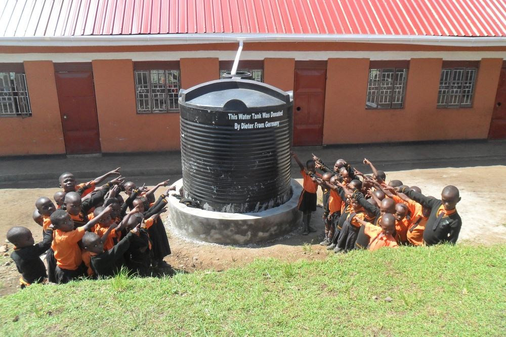 Da die Schule über kein fließendes Wasser verfügt und auf einem Hügel liegt, muss das Wasser mit möglichst vielen Wassertanks während der Regenzeit aufgefangen werden. Die Schule verfügt mittlerweile über insgesamt acht 5.000l Tanks, die auch außerhalb der Regenzeit mit Hilfe des Generator befüllt werden können.